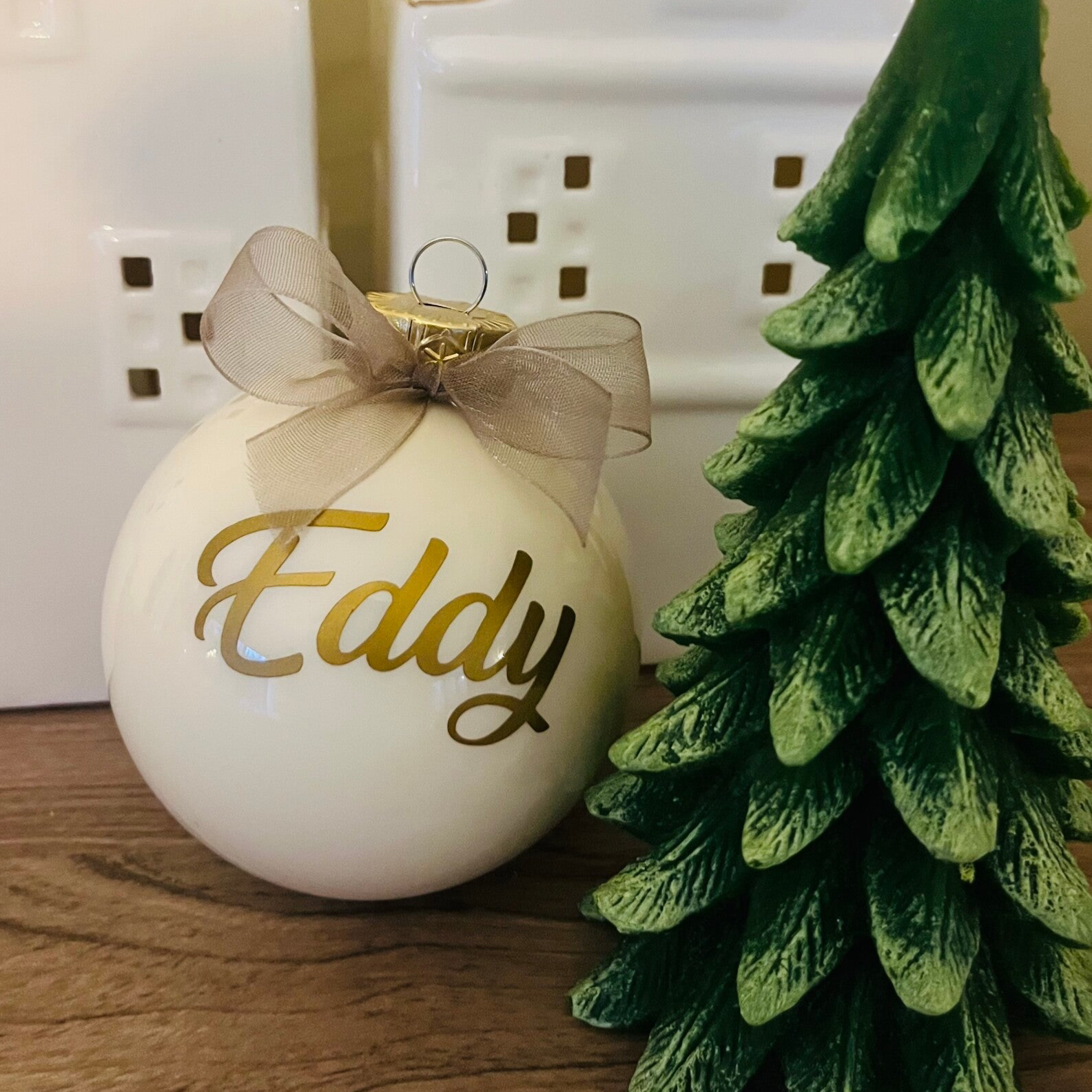 Kerstbal wolwit met naam en passende strik.